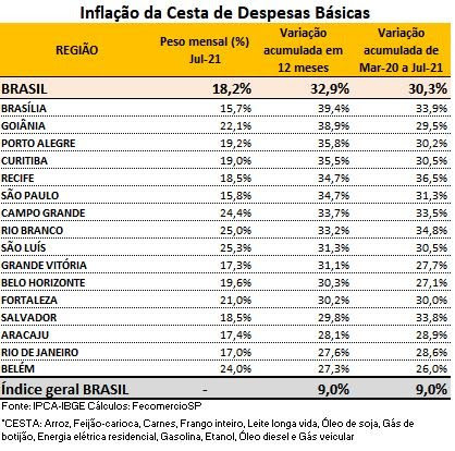 Compõem a cesta itens como o arroz, feijão-carioca, carnes, frango (inteiro), leite (longa vida), óleo de soja, gás de botijão, energia elétrica residencial, gasolina, etanol, óleo diesel e gás veicular. A inflação não concentrada e o fato de estes serem produtos essenciais para a alimentação tornam ainda mais difícil para os consumidores economizarem. De acordo com o estudo, entre março de 2020 e julho de 2021, o avanço médio dos preços no Brasil, para esta cesta específica, foi de 30,3%.