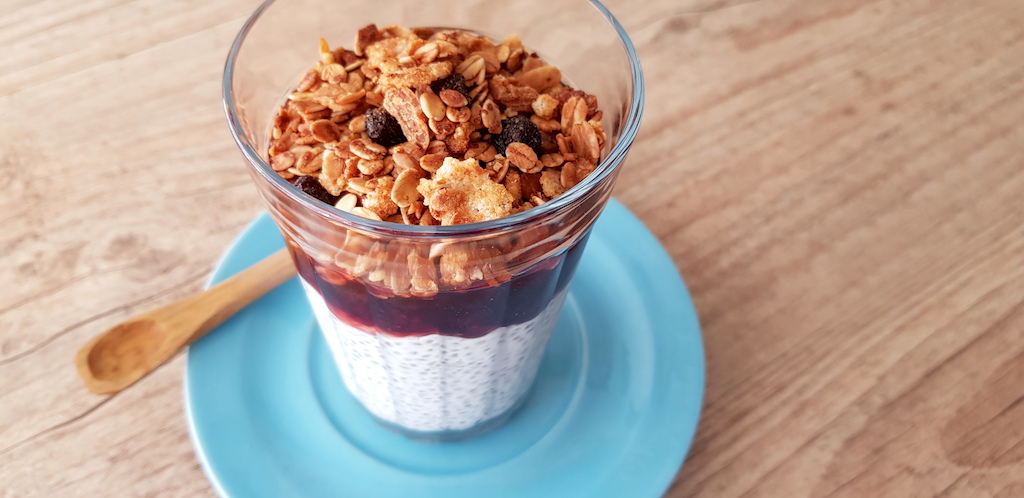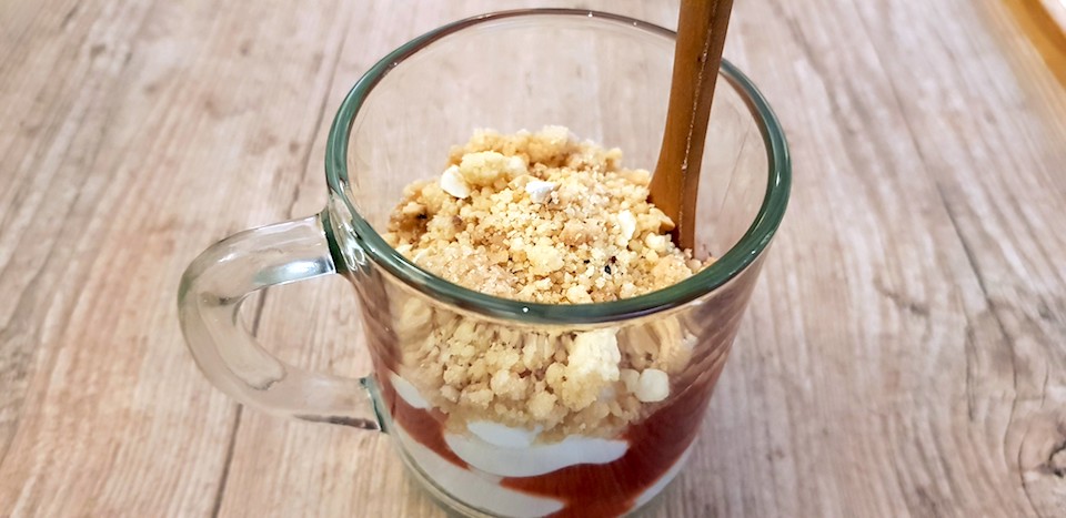A canequinha de iogurte caseiro recebe geleia (delicada) de morango e mix de castanha bem picadinha. Sabor docinho, terno e sem acidez, já que o iogurte é sem aditivos químicos. Melhor iogurte que já comi.