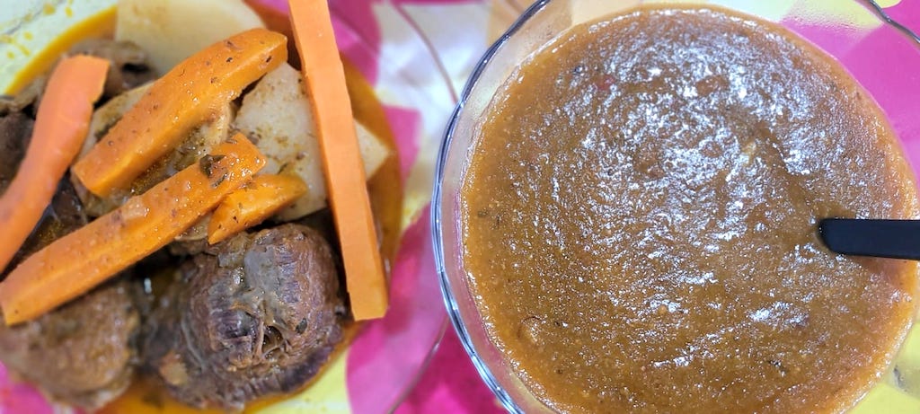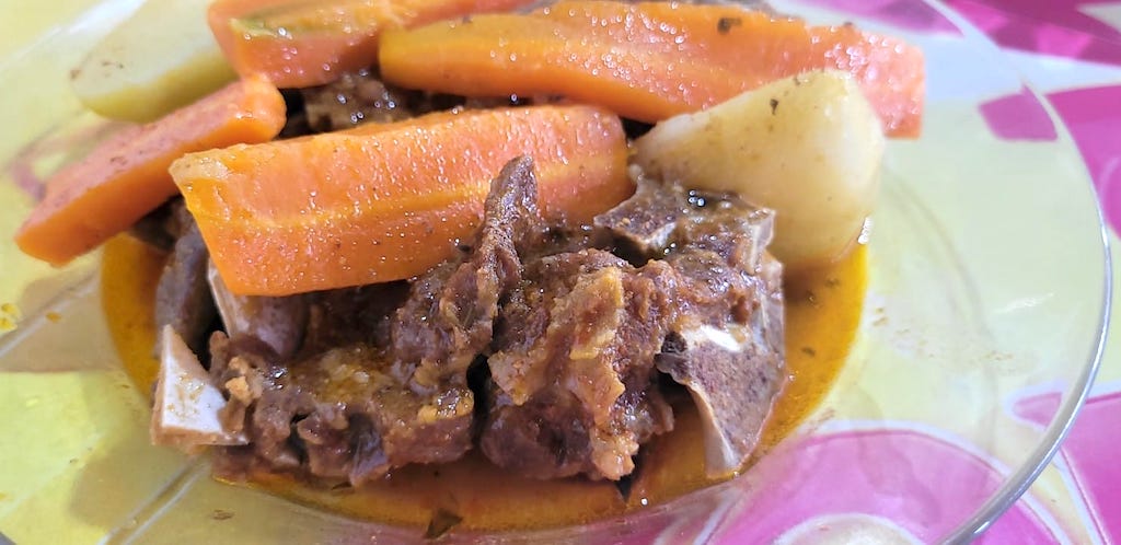 Carneiro guisado com legumes e pirão no bairro de Cruz das Almas