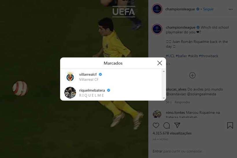 O perfil oficial da UEFA Champions League, a Liga dos Campeões da Europa, no Instagram cometeu uma pequena gafe nesta terça-feira (3/3). Os responsáveis pela competição quiseram prestar uma homenagem ao craque argentino Juan Román Riquelme — ídolo do Boca Juniors que também brilhou nos gramados europeus com a camisa do Villarreal, da Espanha. Porém, acabaram se confundindo e marcando na publicação o Riquelme baterista da banda Aviões do Forró.