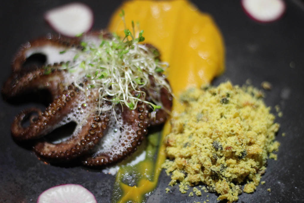 Polvo na espuma de coco com purê de abóbora e farofa de maracujá