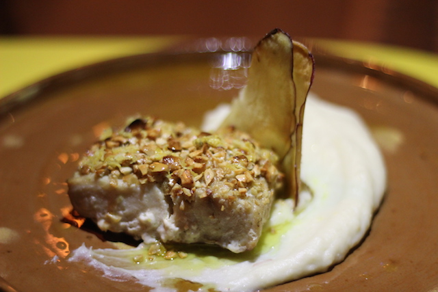 Castanha: O peixe é sempre do dia e, para incrementar, a chef o faz na crosta da castanha, no azeite de limão siciliano e purê de batata doce e cumaru (semente aromática). O peixe é macio e suculento.