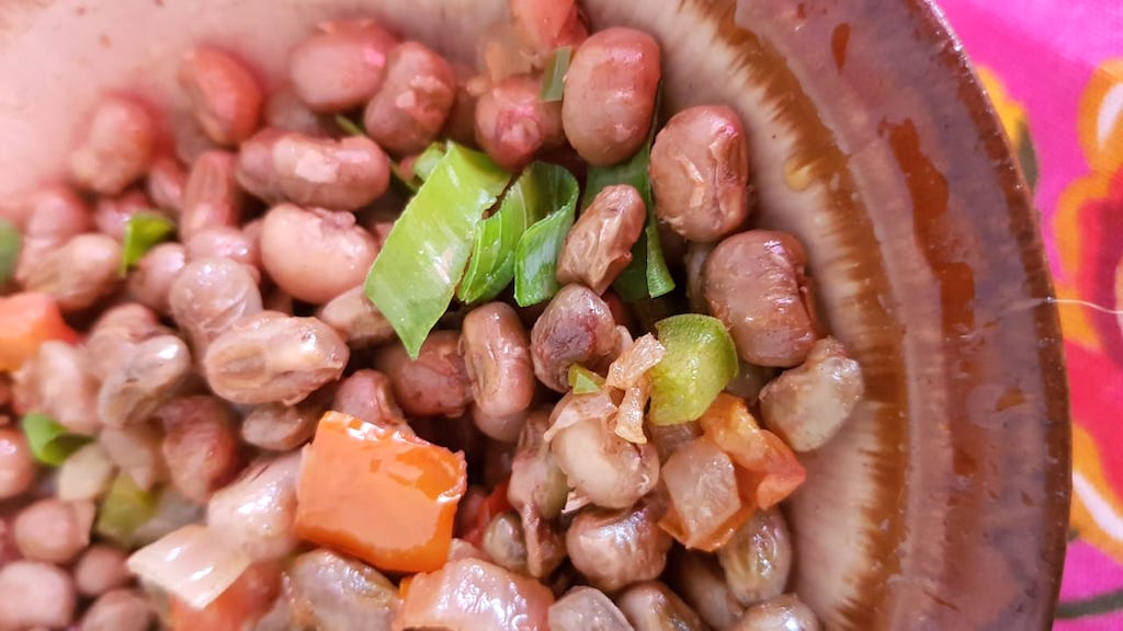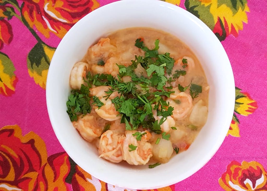 O camarão tropical é o xodó da cozinha do Cléo: tomate, cebola roxa, coentro, pimentão e regado na manteiga do sertão. O crustáceo é servido com arroz e feijão verde.