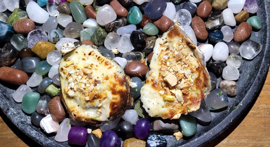A ostra gratinada com queijo, é polvilhada com castanhas de caju e do Pará, e pistache, aliás, as castanhas também estão presentes no carpaccio do peixe do dia. “Gostamos dos peixes frescos, pescados na região, como robalo, cioba, cavala e albacora”, contou o chef Roger.