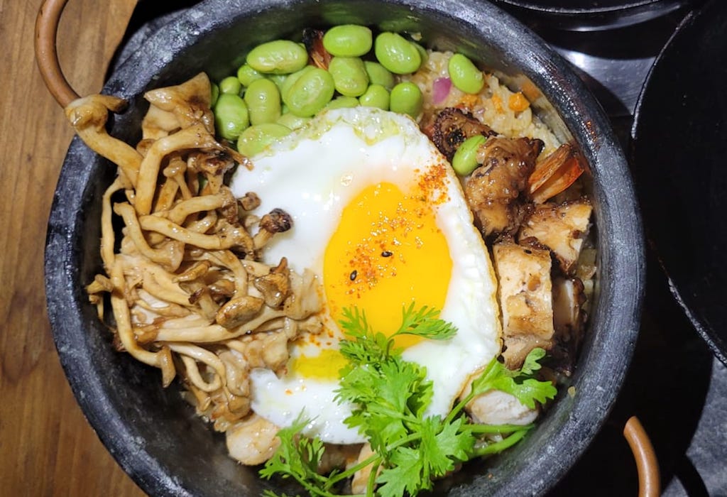 Um dos pratos xodó da casa é o Bibimbap, um prato da cozinha coreana. Literalmente, significa “arroz mesclado” ou “comida mesclada”. Na cumbuquinha vem arroz frito, ovo, cogumelos, soja verde, camarão e polvo, mas para saboreá-lo mistura tudo como manda a tradição.