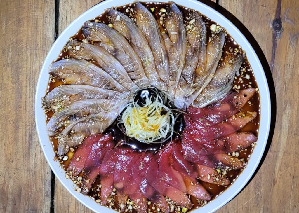 O filé de siri, tão alagoano, virou um bolinho bem saboroso e ganhou reforço de maionese de sriracha (pimenta), maionese de wasabi (raiz) e flor de sal. É de comer rezando, com casquinha crocante da farinha panko (pão de japonês), e as maioneses dão o arremate final.