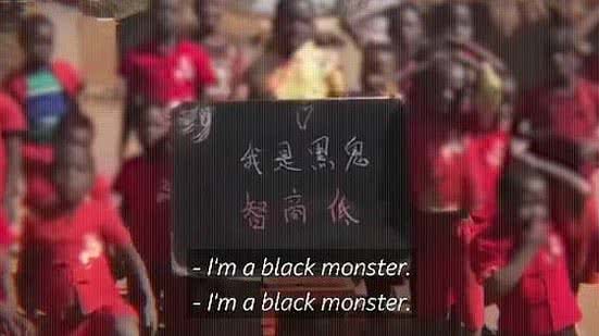 Um dos registros mostra cerca de 15 crianças de uniforme vermelho falando "sou um demônio negro; meu Q.I. é baixo" -"demônio negro" (黑鬼, ou hēi guǐ) é o equivalente racista em chinês para "crioulo". Em outro, um grupo diz estar faminto ao mesmo tempo em que o cinegrafista põe uma porção de batata frita em frente à câmera. Um terceiro exibe um conjunto de crianças e jovens prometendo jamais sair da África.