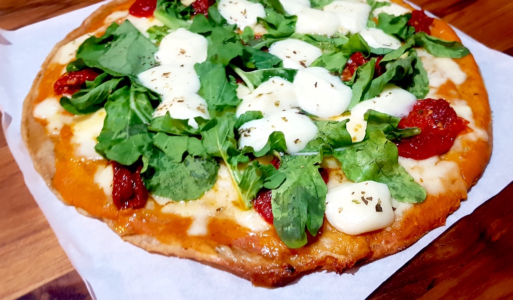 Vittafit: Destaque para a pizza com farinha de arroz integral, goma de tapioca, amido de milho, pasta de alho com cebola, semente de linhaça dourada e chia.