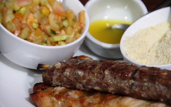 Acompanha o churrasquinho: manteiga de garrafa, vinagrete e a farofinha feita no alho, sal e manteiga. Quem quiser pode pedir uma porção de macaxeira, fica muito legal. Os espetinhos são bem temperados, todos light (com exceção do frango com bacon) e importados da cidade de Delmiro Gouveia.