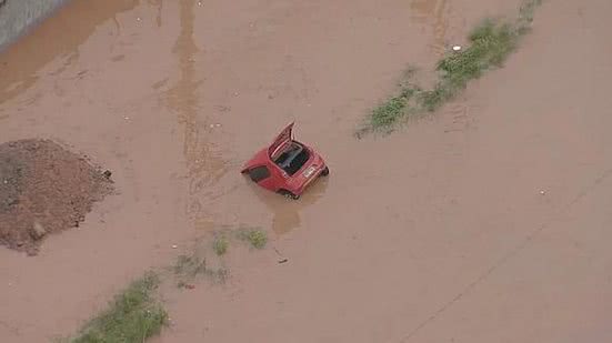 Imagens gravadas pela TV Globo mostram o momento que ocupantes de um carro vermelho que ficou ilhado saem nadando do veículo na Régis Bittencourt (foto em destaque acima).