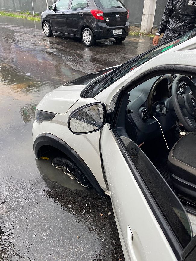 A motorista Nari Melo, que trafegava pela rua Soldado Eduardo dos Santos, no bairro Santo Eduardo, tomou um susto ao cair em um enorme buraco coberto pela água da chuva. "Estava indo no sentido à avenida Deputado José Lajes e já estava tendo cuidado com diversas ruas alagadas. Essa rua Soldado Eduardo também estava alagada e não dava para ver se tinha buraco. Só vi meu carro dentro desse buraco imenso. Foi necessária ajuda de oito pessoas para tentar retirar o carro. Graças a Deus passou um condutor com uma caminhonete Amarok, que tinha uma corda e tentou guinchar o meu carro. Na primeira tentativa, a corda estourou, mas conseguiram fazer um nó e aí tiraram o carro. Se um motoqueiro tivesse passado ali seria muito pior", relatou Nari Melo ao TNH1.