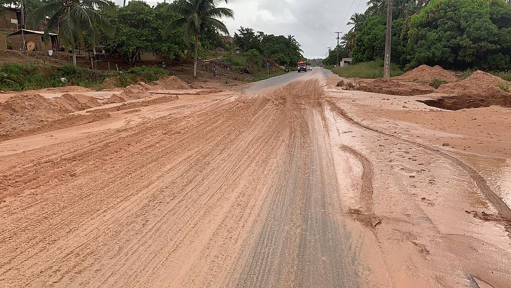 Um vídeo que circulou nas redes sociais neste domingo (8) mostra que um trecho da AL-465, em Japaratinga, no Litoral Norte de Alagoas, ficou parcialmente destruído após uma corrente de água atravessar a rodovia, o que acabou causando um capotamento.