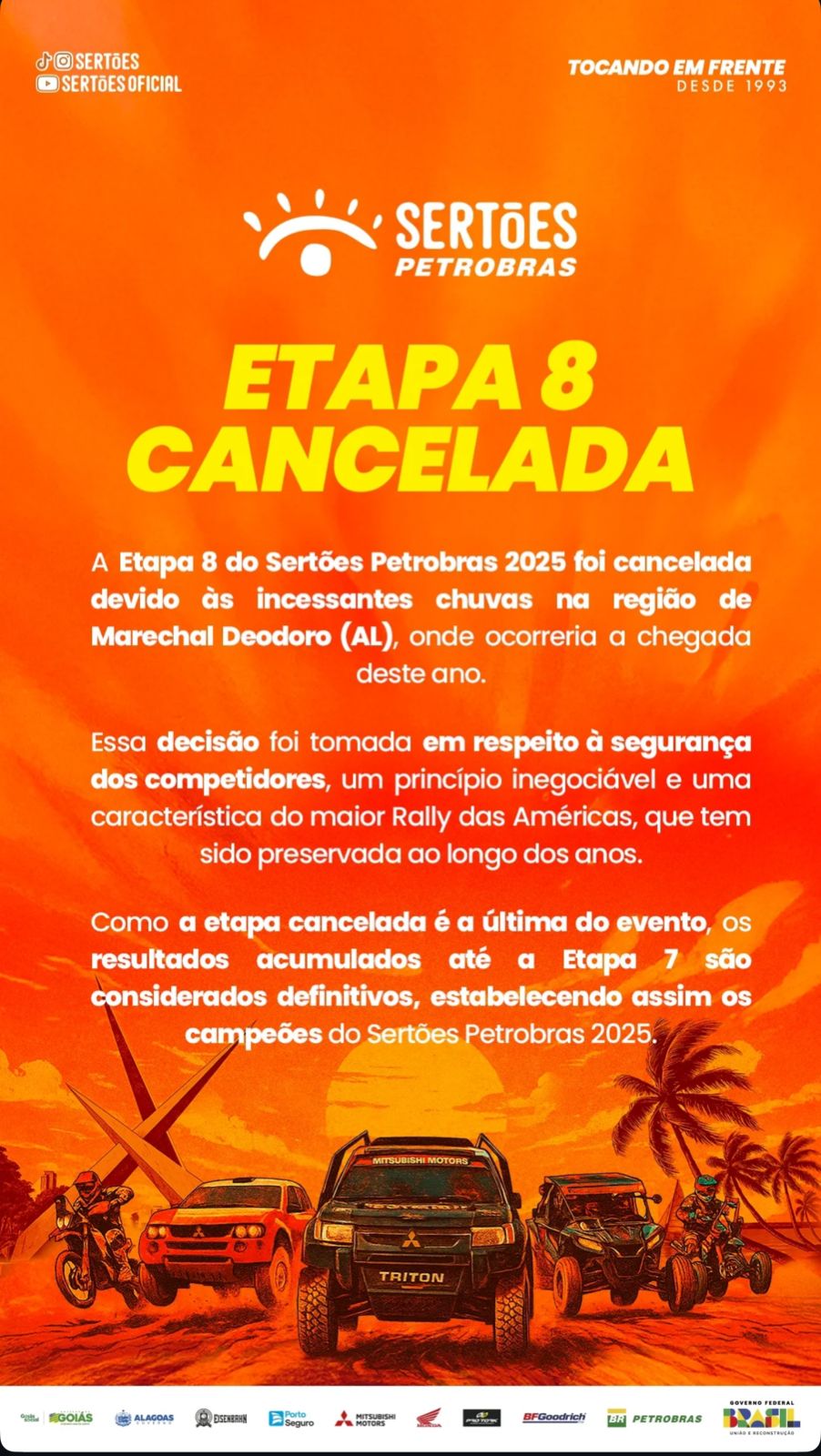 Acabou! O Sertões Petrobras 2025 foi encerrado oficialmente neste domingo (3), após a suspensão da 8ª e última etapa, prevista para acontecer na Praia do Francês, em Marechal Deodoro (AL). Pelo segundo dia consecutivo, a chuva intensa mostrou a força e obrigou a organização a cancelar a prova - a 7ª etapa já havia sido suspensa no sábado.