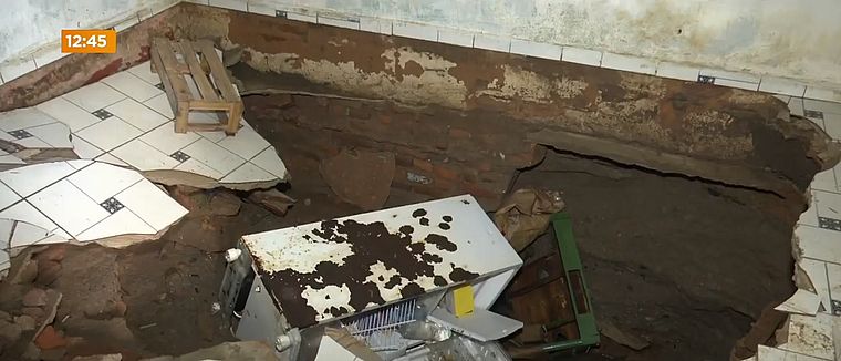 ![]() Buraco engoliu também os eletrodomésticos da cozinha (Foto: Vasni Soares / Reprodução TV Pajuçara) |