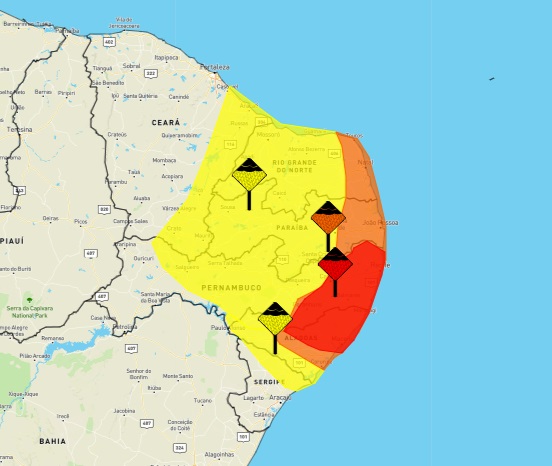 O outro alerta amarelo tem o Sertão alagoano inserido, porém abrange outros estados como Paraíba, Rio Grande do Norte e Ceará, além de Pernambuco. Há baixo risco de alagamentos e pequenos deslizamentos neste dois alertas.