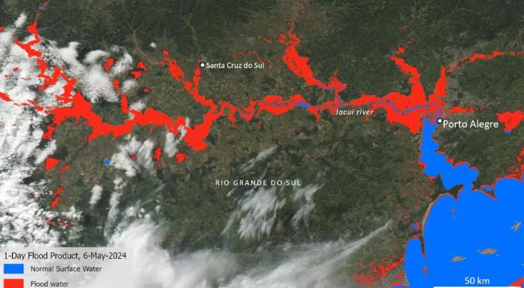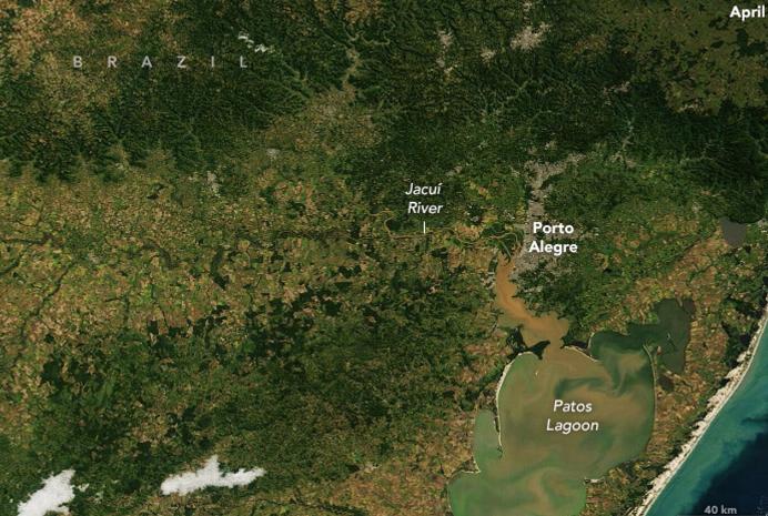 A imagem mais recente mostra os rios Jacuí, Sinos e Caí completamente inundados, com a água extravasando por uma área extensa a partir dos leitos. As águas barrentas chegam ao lago Guaíba e à lagoa dos Patos.