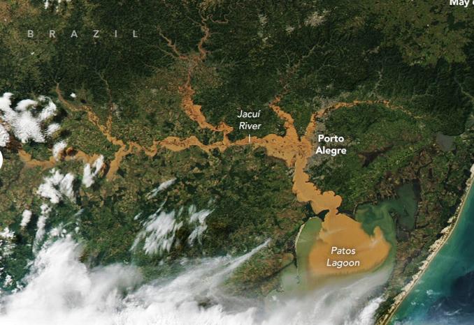 A Nasa, agência espacial ligada ao governo dos Estados Unidos, divulgou imagens captadas por satélite que mostram a dimensão da tragédia provocada pelas chuvas que atingem o Rio Grande do Sul desde a semana passada.