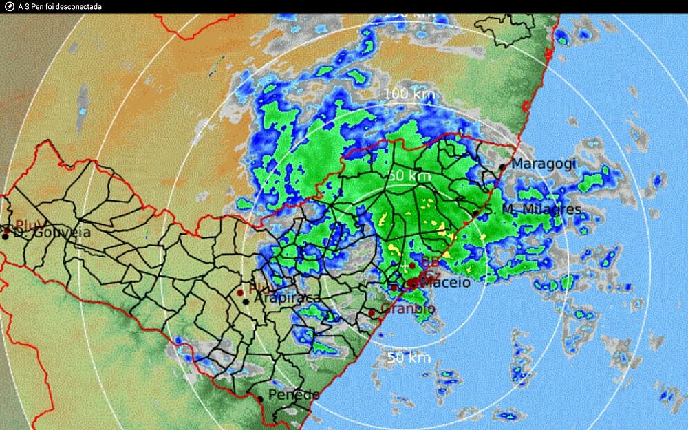 Radar mostra a incidência de nuvens sobre o estado de Alagoas