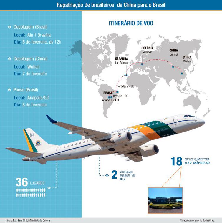 As duas aeronaves da Força Aérea Brasileira (FAB) decolaram ontem (5) de Brasília com destino a Wuhan . A expectativa é que eles tragam de volta ao Brasil as 34 pessoas (brasileiros e parentes) que se encontram na cidade epicentro do surto de coronavírus. Na volta, as aeronaves farão cinco escalas: Urumqi (China), Varsóvia (Polônia), Las Palmas (Espanha) e Fortaleza (CE), até o pouso final em Anápolis (GO).