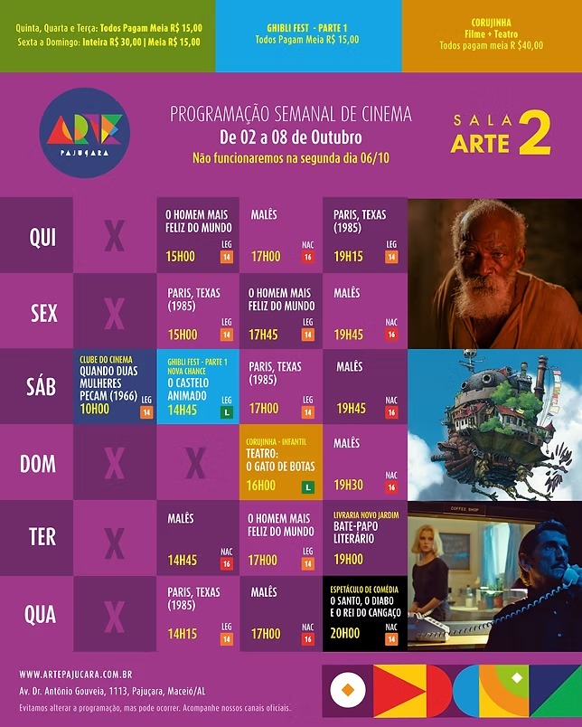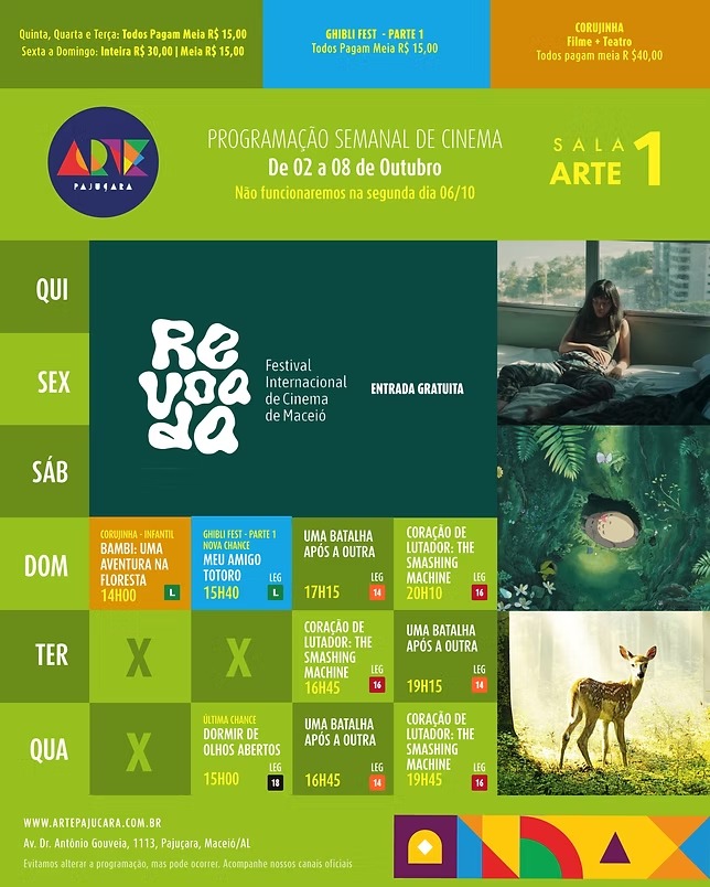 Para conferir a programação completa de todos os filmes em cartaz no Arapiraca Partage Shopping, Centerplex (Shopping Pátio Maceió), Cinesystem (Parque Shopping) e Kinoplex (Maceió Shopping): basta clicar aqui. Já para o Shopping da Vila, em Delmiro Gouveia, pode ser conferida aqui.