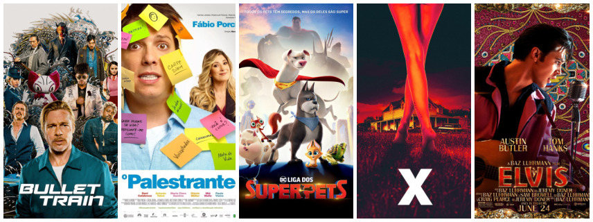 A rede Kinoplex traz a estreia de 'Trem-Bala' e 'O Palestrante', além da estreia oficial de 'X - A Marca da Morte' após as sessões de pré-estreia na semana passada. Seguem em exibição 'DC Liga dos Super-Pets', nova animação da DC, 'Elvis', longa sobre a vida do "Rei do Rock", 'Telefone Preto', 'Pluft, o Fantasminha', 'Thor: Amor e Trovão' e 'Top Gun: Maverick'.