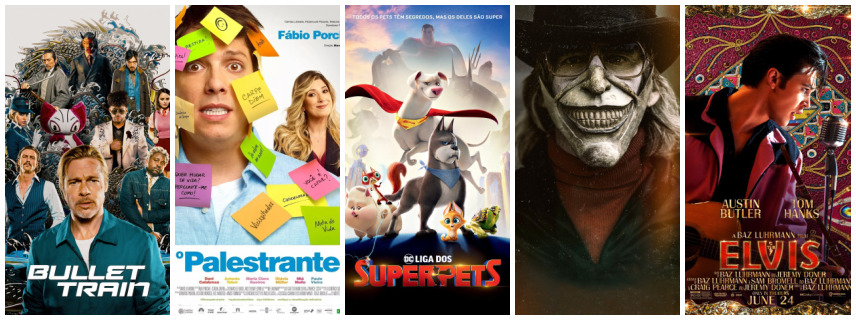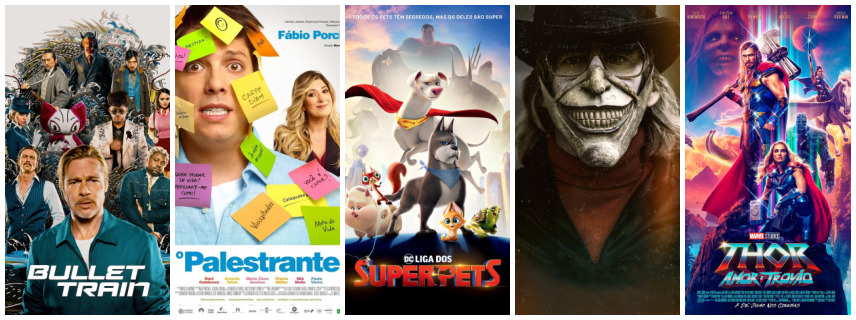 Na parte alta da cidade, 'Trem-Bala' e 'O Palestrante' chegam com destaque. Ainda em exibição 'DC Liga dos Super-Pets', 'Elvis', 'Telefone Preto', 'Thor: Amor e Trovão' e 'Minions 2: A Origem de Gru'.
