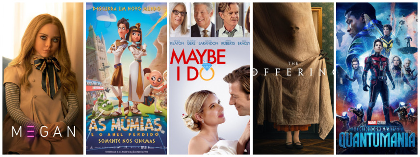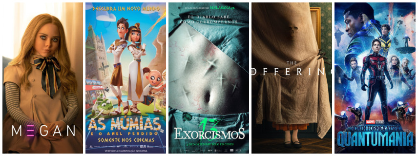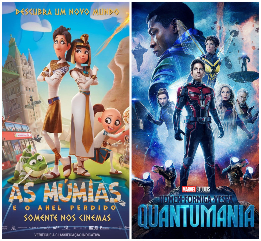 Na parte alta da cidade, ‘As Múmias e o Anel Perdido’ e ‘13 Exorcismos’ estreiam com destaque. ‘Homem-Formiga e a Vespa: Quantumania’, ‘Oferenda ao Demônio’, ‘M3gan’, ‘Gato de Botas 2: O Último Pedido’ e ‘Avatar: O Caminho da Água’ continuam em cartaz.