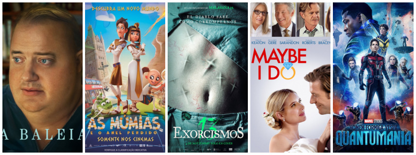 A rede Kinoplex traz as estreias de ‘A Baleia’, As Múmias e o Anel Perdido’, ‘13 Exorcismos’ e ‘Casamento em Família’. ‘Homem-Formiga e a Vespa: Quantumania’, ‘Oferenda ao Demônio’, ‘M3gan’ e ‘Gato de Botas 2: O Último Pedido’ continuam em cartaz.