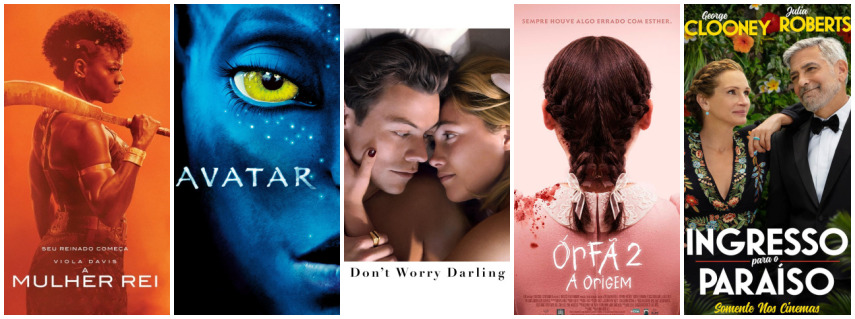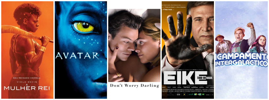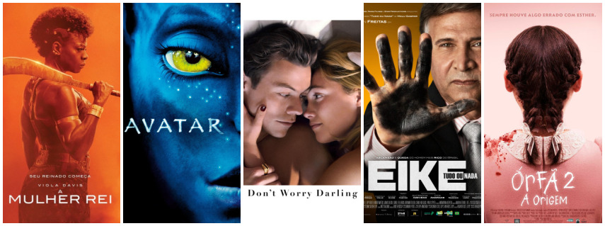 Na parte alta da cidade, ‘A Mulher Rei’, ‘Avatar’, ‘Não Se Preocupe, Querida’ e ‘Eike - Tudo Ou Nada’ estreiam com destaque. ‘A Órfã 2: A Origem’, ‘Uma Pitada de Sorte’, ‘Não! Não Olhe!’, ‘Telefone Preto’, ‘Thor: Amor e Trovão’ e ‘Minions 2: A Origem de Gru’ continuam em cartaz.