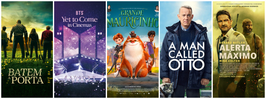 A rede Kinoplex traz a estreia do suspense épico ‘Batem à Porta’, a gravação do show ‘BTS: Yet to Come’ e a mais nova animação ‘O Grande Mauricinho’. ‘O Pior Vizinho do Mundo’, ‘Alerta Máximo’, ‘M3gan’, ‘A Profecia do Mal’, a animação ‘Gato de Botas 2: O Último Pedido’ e ‘Avatar: O Caminho da Água’ continuam em cartaz.