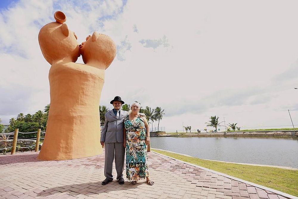 A emoção de Irinéia Rosa Nunes da Silva, 69 anos, era enorme; tinha o tamanho da réplica de “O Beijo”, com seis metros de altura, uma das peças mais expressivas da artesã, que foi instalada na Lagoa da Anta, praia de Jatiúca. “Eu não ando chorando à toa, mas tem hora que a gente não se sustenta e a lágrima tem que cair mesmo, de alegria e de emoção”, confessou Dona Irinéia, moradora da comunidade quilombola do Muquém, em União dos Palmares.