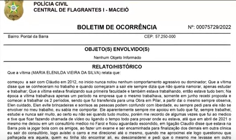 O programa Fique Alerta, da TV Pajuçara/Record TV, exibiu nesta terça-feira, 19, o boletim de ocorrência feito por Elen. Aos policiais, ela contou que conheceu Cláudio no trabalho em 2012 e que no início não notou nenhum comportamento agressivo ou dominador no companheiro.