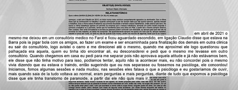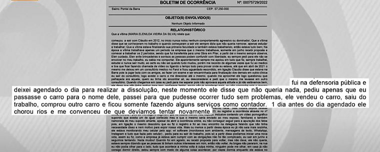"Em abril de 2021, o mesmo me deixou em um consultório médico no Farol e ficou aguardando escondido. Em ligação, Cláudio disse que estava na Barra, pois iria jogar bola com os amigos. Ao fazer um exame e ser encaminhada para a finalização dos demais em outra clínica, saí do consultório, logo avistei o carro e me direcionei até o mesmo. Quando me aproximei, ele logo questionou que palhaçada era aquela, quem eu tinha ido encontrar ali. Eu desconsiderei e pedi que o mesmo me levasse em outro consultório. Quando chegamos em casa, eu pedi para me separar, pois não aprovava aquela atitude e já não estávamos bem".