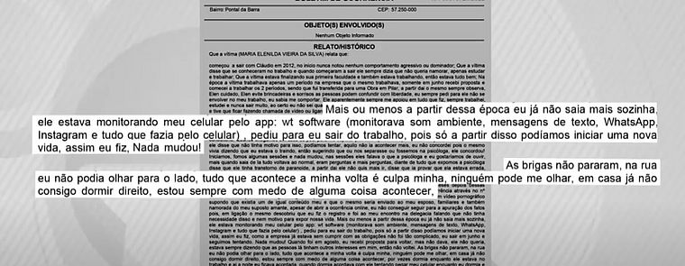"Mais ou menos a partir dessa época, eu já não saía mais sozinha. Ele estava monitorando meu celular por um aplicativo que monitorava som ambiente, mensagens de texto, Whatsapp, Instagram e tudo que fazia pelo celular. Pediu para eu sair do trabalho, pois só a partir disso podíamos iniciar uma nova vida. Assim eu fiz, nada mudou. As brigas não pararam, na rua eu não podia olhar para o lado, tudo que acontecia à minha volta é culpa minha, ninguém pode me olhar. Em casa, já não consigo dormir direito. Estou sempre com medo de alguma coisa acontecer".