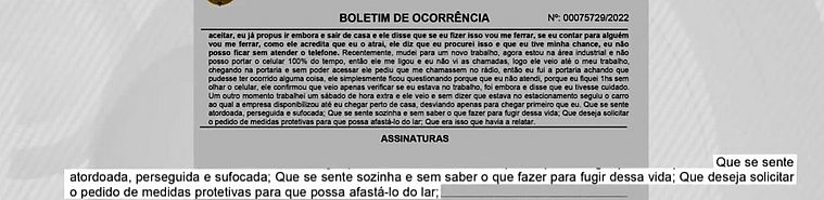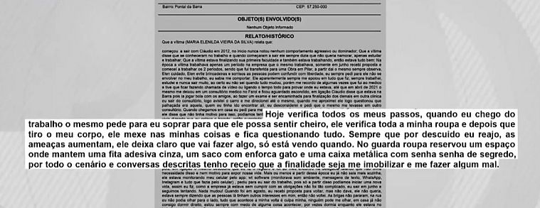 "Hoje verifica todos os meus passos. Quando eu chego do trabalho, o mesmo pede para eu soprar para que ele possa sentir o cheiro. Verifica toda a minha roupa e depois que tiro, o meu corpo. Ele mexe nas minhas coisas e fica questionando tudo. Sempre que por descuido eu reajo, as ameaças aumentam. Ele deixa claro que vai fazer algo, só está vendo quando. No guarda roupa, reservou um espaço onde mantém uma fita adesiva cinza, um saco com enforca gato e uma caixa metálica com senha de segredo. Por todo o cenário e conversas descritas, tenho o receito que a finalidade seja me imobilizar e me fazer algum mal".