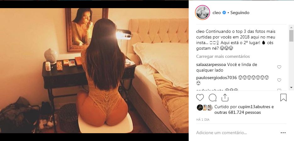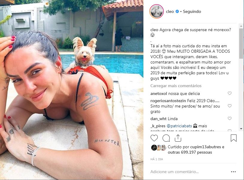 Em primeiro lugar, a foto que mais bombou de Cleo foi uma em que ela aparece deitada de biquíni com seu cachorrinho apoiado em cima de seu bumbum.