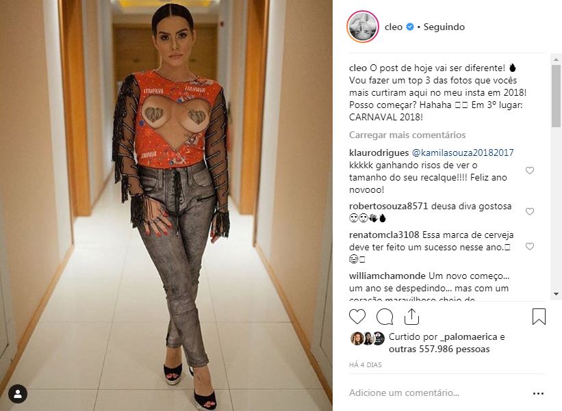 Em terceiro lugar, Cleo lembrou seu look de Carnaval, em que ela veste calça jeans e salto alto, mas está com os seios de fora, apenas cobertos por adesivos em formato de coração.