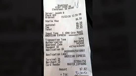 Após pedir apenas uma cerveja em um restaurante em Cleveland (EUA), um homem deixou uma gorjeta no valor de US$ 3.000 (R$ 15,6 mil). A história foi relatada no Facebook por Brendan Ring, dono do estabelecimento, e ganhou reportagens em site e jornais ao redor do mundo.
