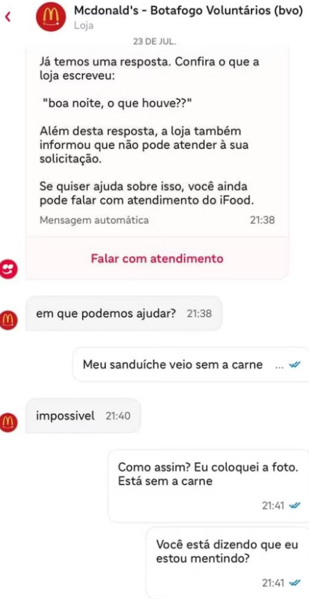 Ela entrou em contato com a loja por meio do iFood e relatou o problema. A resposta que recebeu da lanchonete foi: "impossível".