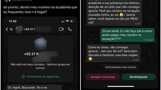 Na publicação, a consumidora identificada como Ingrid Germanno escreveu: “ah pronto, deram meu número na academia que eu frequento, isso n [sic] é ilegal?” Na sequência, ela compartilhou o print da conversa que expõe a situação. Na troca de mensagens, o aluno que solicitou o número de telefone diz que Germanno “chamou atenção” na academia e que, por isso, solicitou seu contato na recepção.
