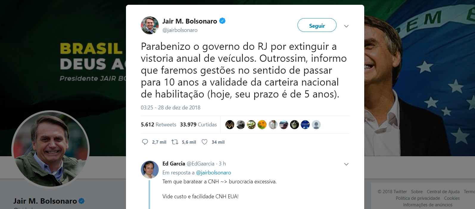 Na manhã desta sexta, dia 28, o presidente eleito escreveu em sua conta no twitter que pretende ampliar a validade da Carteira Nacional de Habilitação de 5 para 10 anos, veja: