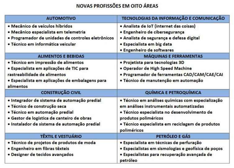 As outras dez profissões listadas estão nas áreas de Máquinas e Ferramentas (projetista para tecnologias 3D, operador de High Speed Machine, programador de ferramentas CAD/CAM/CAE/CAI e técnico de manutenção em automação); de Química e Petroquímica (técnico em análises químicas com especialização em análises instrumentais automatizadas, técnico especialista no desenvolvimento de produtos poliméricos e técnico especialista em reciclagem de produtos poliméricos); e de Petróleo e Gás (especialista em técnicas de perfuração, especialista em sismologias e geofísica de poços e especialista para recuperação avançada de petróleo).