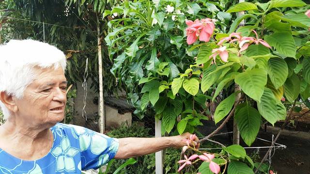 Dona Geo no seu quintal também gosta de cultivar plantas e flores