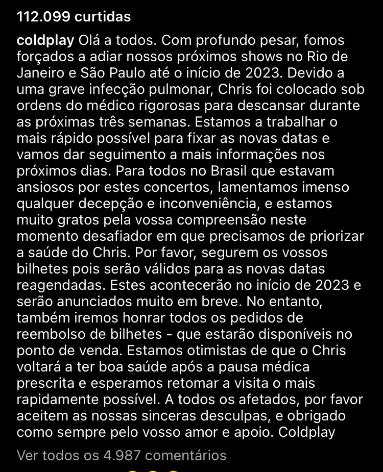 “Estamos trabalhando para ter as novas datas o mais rápido possível e divulgaremos mais informações nos próximos dias”, acrescentou o Coldplay.