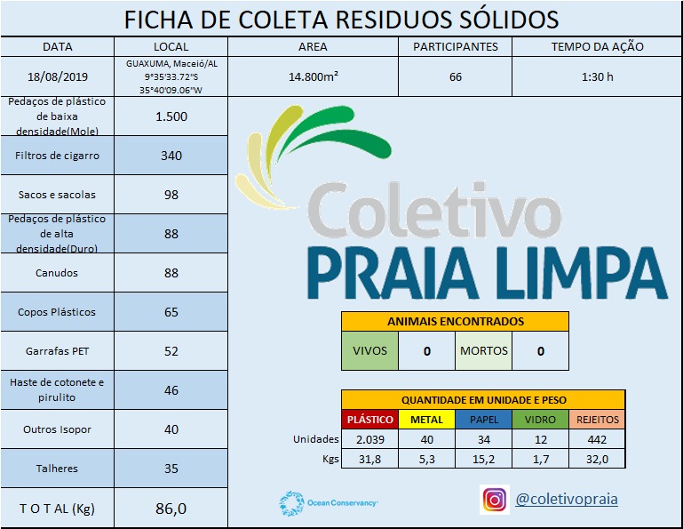O grupo Coletivo Praia Limpa é uma organização sem fins lucrativos que reúne voluntários que resolveram abraçar a causa do meio ambiente, em defesa dos ecossistemas litorâneos, especificamente as praias do estado de Alagoas.