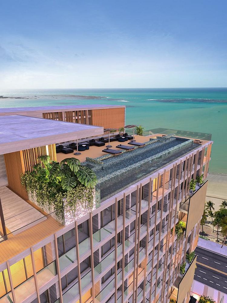 Assinado pelo arquiteto Adriano Moura, o New Time traz uma vista com 240° do mar, com esquadrias que vão do piso ao teto, proporcionando a menor interferência visual possível e a sensação de levitar sobre o mar da Pajuçara. A área de lazer também merece destaque entregando espaços comuns distribuídos por 7 dos 15 pavimentos que compõe o edifício. “Desenvolver este projeto foi maravilhoso e o resultado, de fato, é surpreendente. A intenção que buscamos era exatamente fazer com que a orla e o New Time se complementassem em uma conexão única. Assim, quem estiver no New Time não estará simplesmente observando o mar, mas terá a sensação, também, de que o mar o observa”, ressaltou Adriano.