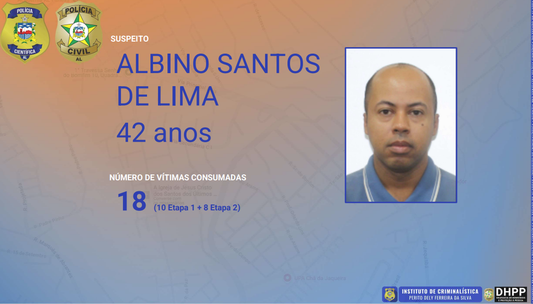 A Polícia Civil de Alagoas (PC-AL) e o Instituto de Criminalística de Maceió forneceram detalhes, em uma coletiva à imprensa, na manhã desta terça-feira (25), sobre mais crimes atribuídos ao serial killer Albino Santos de Lima. Somando, chegam a 18 os crimes homicídios a Albino e mais seis tentativas de homicídio. Na apresentação feita na coletiva, (imagem acima), a polícia listou todas as 18 vítimas do assassino.
