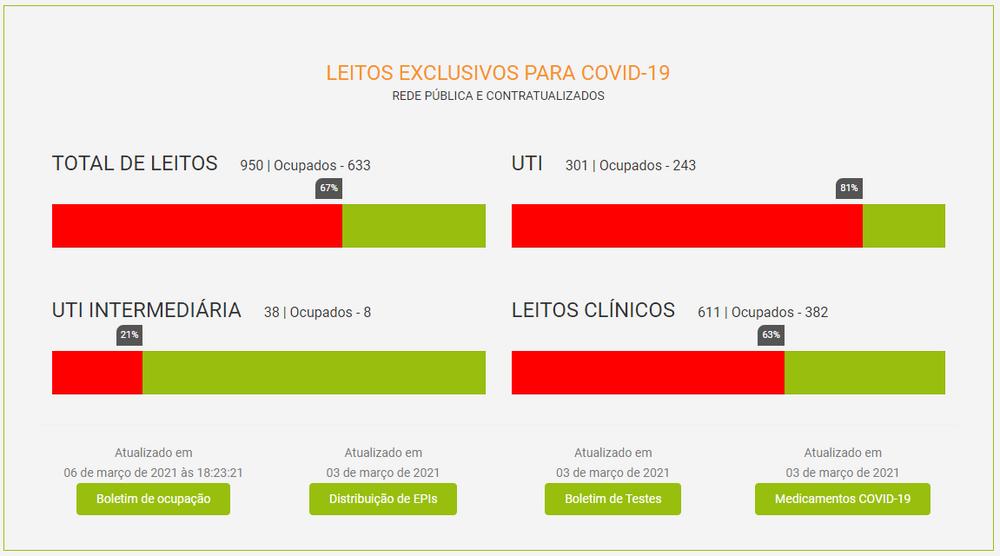 Dos 341 leitos de UTI disponibilizados pela Secretaria de Estado de Saúde (Sesau), 243 já estão ocupados, o que chega a porcentagem de 81% de preenchimento. Na última segunda, o Estado estava com 72%, o que mostra a crescente de 9% de ocupação em cinco dias.