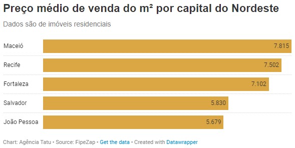 Os valores ressaltam a disparidade no mercado imobiliário do Nordeste, evidenciando a influência dos preços médios por metro quadrado e os rendimentos locais. Somente o bairro da Pajuçara, na capital alagoana, tem o metro quadrado médio mais caro de toda a cidade, chegando a custar em média mais de R$9 mil reais. Apenas o bairro de Meireles, em Fortaleza, tem um valor médio maior.