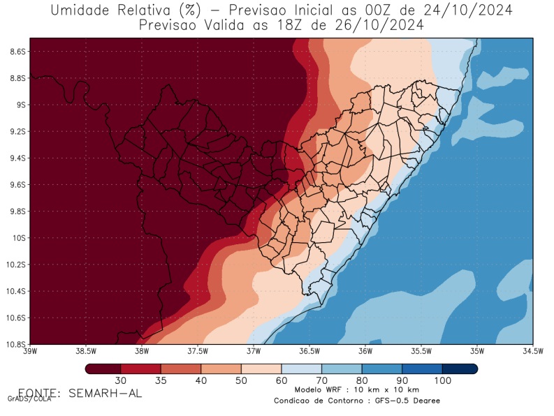 Segundo a Superintendência de Prevenção em Desastres Naturais (SPDEN/SEMARH/AL), as rodadas mais recentes desses modelos numéricos de condições meteorológicas indicam ocorrência de baixa umidade relativa do ar que pode gerar risco para a população.